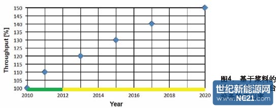根据规模经济理论,设备的生产能力需要通过提升良率和生产线的产出率得以实现,从而降低劳动力成本和生产每个产品的平均设备成本。通过观察硅锭生长制造工艺,硅片切片以及硅片清洗可以明显的看出该趋势。到2020年,多晶硅和单晶硅硅锭的生长将比2010年分别增加45%和20%(见图3)。线锯产出将在如图4所示的时间内增加50%。