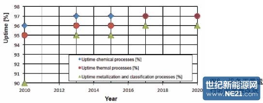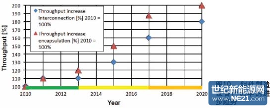 为了减少占地面积,组件制造设备需要占有更小的面积(见图9)并具有更高的产出率。更高的产出率需要结合持续的进步以及新的技术发展,尤其是互联技术和封装工艺。这就需要新的封装材料和更短的工艺时间。预计到2015年,互联技术将有很大的发展,背接触电池概念将被引进。