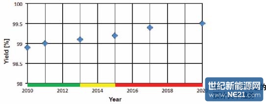 该估计的基础是当下电池的概念,增加的工艺步骤极其有限。图8是组件制造的预计良率。数据说明了除了正在进行的硅片减薄和新线锯技术之外的持续技术改进。为了在2015年之后在<150μm的电池上获得>99.3%的良率,需要改善互连技术和消除应力的支持结构。在2015年之前需要在量产中采用无铅焊接,并引入无铅电池金属化技术。