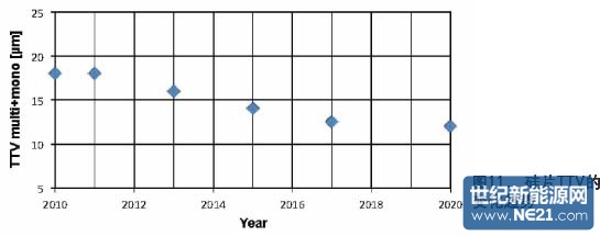 除了制造参数外,转化效率也预计会得以提升。下面将重点介绍实现这一改进的工艺参数。从电池制造的角度看,反应需求的一个必要的要求是总厚度变化(TTV)的减小。硅片的TTV应该在没有任何多余成本的条件下不超过总厚度的10%(见图11)。