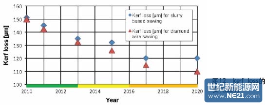 如图12所示,另一个富有挑战性的参数是kerf loss。随着硅片厚度的减薄,kerf loss也必须随之减小以实现硅消耗量的显著下降。随着宝石线锯工艺的引入, 该目标将得以实现。