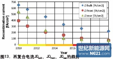 光伏电池正面和背面以及多晶硅材料的再复合损失必须减小。描述再复合损失的一个办法是再复合电流J0bulk、J0front、J0rear,它们分别描述的是块状材料、电池正面和背面的再复合损失。图13是所有再复合电流的降低趋势。