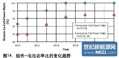 从电池组件获得尽可能大的功率是非常关键的。描述该性能的参数是组件-电池功率比,定义为组件功率/(电池功率x 电池数目)。如图14所示,对于多晶硅电池来说,该比率为98%,单晶硅为96%。2013年,预计该比率将增长1%,这主要是由于AR玻璃的引入。从2015年开始,新的互连技术和封装材料将使该比率进一步提升1%。