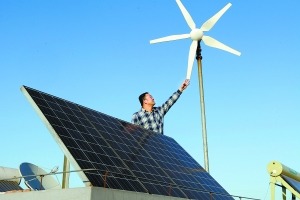 OFweek太阳能光伏网讯,4月6日,申请个人卖电业务的居民董强在调试自家屋顶装置的光伏太阳能板和风力发电设备。