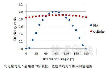 圆筒型太阳能电池具有以下几个优点:(1)相对于光的入射角度的变化,发电输出的变化变小;(2)封装部分的比表面积等减小,因此认为有望提高耐久性等。