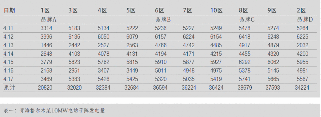 各种逆变器在外观和部件排列设置上的相似度越来越高,但是性能表现却开始出现较大的差别。图一是格尔木地 区 一 座 1 0 M W 电站 的 在 今 年 四 月 中 旬 的 一 周 发 电 量 数据,从中可以看出逆变器的表现情况。