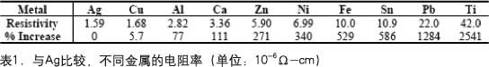 确定Ag合适替代品的主要考虑因素是材料的丰度和电阻率。作为指形电极,替代金属的电阻率必须低且与Ag的电阻率相当。若采用较高电阻率的金属,为了保持同样的指形电阻,指形电极的宽度或高度就不得不增加。这样,或者电池效率受损,或者制造难度增加。