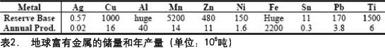 表2根据U.S.Geological Survey列出各种金属已知的储备量和目前的年产量。储备量包括有经济价值和经济价值不大的资源。依据储量和年产量,Ag比不过其他金属。Sn的年产量与其他金属比也很小。Cu和Al二者有巨大的储量,它们的年产量在数千万吨范围内,足以支持万亿瓦级硅片太阳能电池的生产。