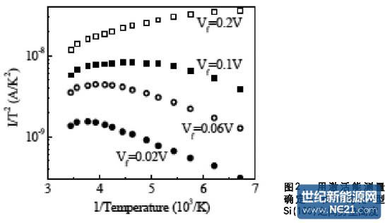 实验是在低剂量1015cm-3Sb掺杂n型Si(100)硅片上进行的。钝化后,在硅片上用电子束蒸发和剥离(lift-off)工艺制作直径200μm的Al圆点。重要的是,钝化后的溅射工艺要缓和,因为溅射淀积能破坏钝化层。图2说明确定Se钝化n型Si(100)上Al势垒高度的激活能测量,以及斜率给出的势垒高度。取决于偏压,势垒高度在0.06-0.10eV间变化,远远低于Al/n型Si接触长期建立的值0.72eV。