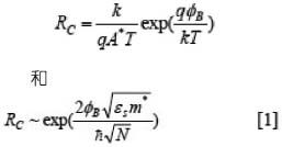 创纪录低的势垒高度应导致Al和n型Si间极低的接触电阻。轻掺杂与重掺杂Si的接触电阻分别由下面二式给出: