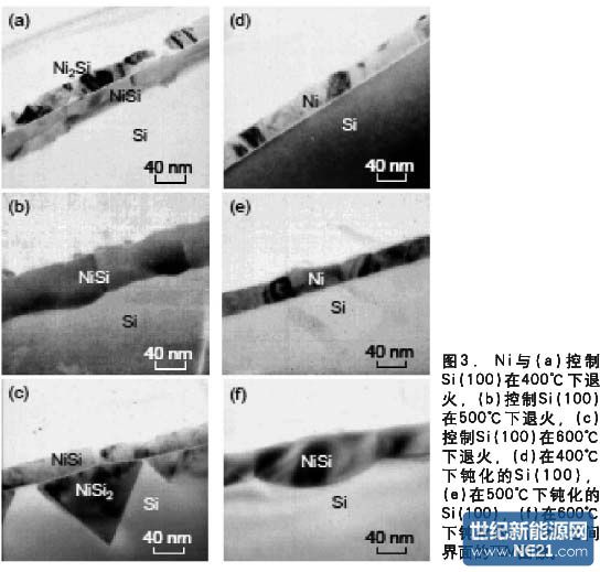 实验是通过检验在Se钝化Si(100)表面上Ni硅化进行的。在二片Si(100)硅片上淀积50nm Ni膜,一片有Se钝化,另一片没有Se钝化。在N2中400-700℃间加热这些样品60秒进行硅化,用透射电子显微镜检查Ni/Si界面。结果示于图3。对于没有Se且在400℃下退火的控制样品,观察到硅化,结果在Ni和Si间有二层硅化物堆叠(图3(a))。这证实了Foll等人早先对于Ni硅化的TEM研究。他们的结论是,二层堆叠分别为Ni2Si和NiSi。500℃退火后,单层NiSi出现在控制样品的Ni/Si界面(图3(b))。但是,钝化样品的表现完全不同。400℃退火后(图3(d)),Ni与Se钝化Si(100)表面间没有硅化而且界面陡削。500℃退火后,Ni与Se钝化Si(100)表面间仍然没有明显的反应(图3(e))。仅仅在600℃退火后,Ni与Se钝化Si(100)反应形成单层NiSi(图3(f))。因此,Ni/Se钝化Si(100)界面的热稳定性是~400℃。