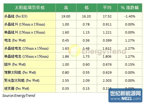 多晶硅现货价持续下滑,平均价格来到$17.75 USD/kg,跌幅为1.4%;在硅晶圆方面,受到四月需求大致底定的影响,