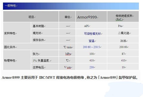 索比光伏网讯:伊藤技研「Armor®999」的API系印刷浆料在背接触太阳能电池片的电极间起到绝缘作用。比传统的太阳能背膜效果更完美,由于浆料是液态的,通过丝网印刷工艺,印刷在电池片上,浆料在没有固化前会自然流平、紧密的填充包裹在电池片导电部位。API材料中加入可溶性树脂填充材,在获得出色的印刷性的同时,还拥有极佳的机械强度与绝缘性。