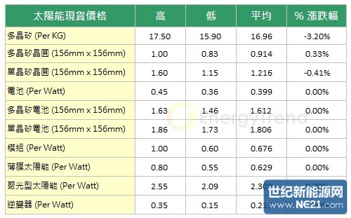 不过,透过太阳能储能系统的导入下,却可以明显改善太阳能发电的供电稳定度和持久性,这也是太阳能发电除了发电成本这个挑战外,另一个让各界比较疑虑的问题。就目前公布的内容来看,德国政府将提供2500万欧元的补助,家庭和公司的太阳能储能系统在2013年5月1日之后安装者都可适用于这项法案。根据EnergyTrend的研调,该法案的补助规模原规划6000万欧元,而目前推行的最终版本补助规模缩小一半以上,对于太阳能储能系统的推广或许会出现一些延宕。就现货市场整体表现来看,大陆市场价格缓步下滑的局面仍未停止,多晶矽报价来到$120 RMB/kg到$130 RMB/kg之间;在矽晶圆方面,四月订单交货已经至尾声,五月订单开始议价,然逼近欧洲双反(anti-dumping and countervailing)公布的时程,大陆业者心态转趋保守,多晶矽晶圆与单晶矽晶圆的市场价格维持与上周雷同;而受到五月市场需求动能出现下滑的疑虑,电池与模组的市场价格维持也与上周雷同。