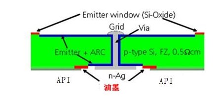 图一、给出常规MWT太阳能电池的截面图。MWT太阳能电池与传统太阳能电池结构相比,主要不同点是前者表面的发射极所收集的电流由穿过硅基体的金属导线引导到电池的背面,使得其正负电极都位于电池的背面。因此在制作MWT电池光伏组件时,电池片之间的连接均由背面接触电极提供。这样既不需要为了方便焊接而在电池正表面制作导电主栅线,又可降低由连接焊带引起的电阻损耗,从而提高了电池转化效率和组件输出功率,将电池到组件(CTM)损耗降低到最小。
