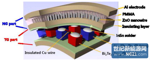 图 由纳米发电机与热电发电机组成的柔性混合能源电池,这种垂直堆叠的混合装置可用于同时收集热能和机械能。