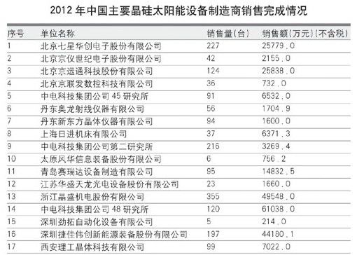 我国17家主要晶硅太阳能电池设备制造商,2012年晶硅材料生产加工设备销售收入达到11.16亿元,同比减少67.6%。晶硅太阳能电池芯片制造设备销售收入14.16亿元,同比减少52.7%。