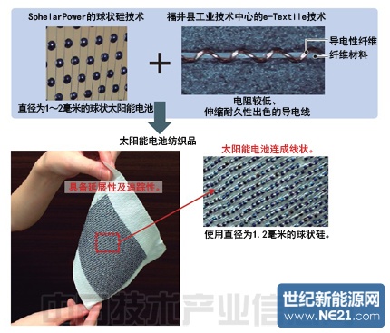 该纺织品是将直径为1.2毫米的球状硅太阳能电池连成直线状,然后以此为纬线,编入经线制成。开发方并未公布将太阳能电池连成线状的具体方法等,但据称是通过结合SphelarPower的球状硅太阳能电池技术与福井县工业技术中心的导电线技术实现的。