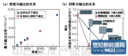 | 图5 在暗处也能发电 罗姆开发出了在低照度下也能发电的色素增感型太阳能电池(a)。研究结果证实,与薄膜硅型太阳能电池相比,色素增感型太阳能电池即便遮住部分模块,发电量下降也较少(b)。(图:由本刊根据罗姆的资料制作而成) |
