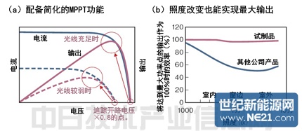 | 图6 配备MPPT功能 富士通半导体在与小型太阳能电池配套使用的功率控制IC上,配备了简化MPPT功能(a)。借助该功能,即使照度发生变化,也能实现最大输出(b)。(图:由本刊根据富士通半导体的资料制作而成) |