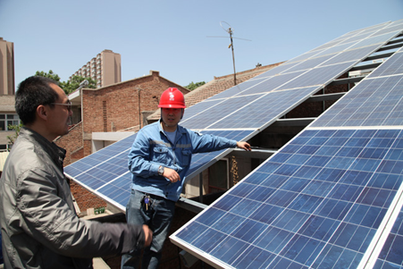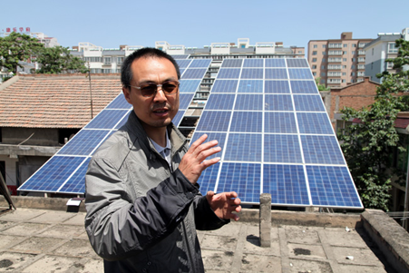 在夏宝国身旁,是同为太阳能爱好者的孙稳航师傅,近期他准备在位于西安的自办工厂上建立光伏发电站,正在这里参观取经。夏宝国说:“现在我上班的时候,只要天气晴朗,心情就特别好,因为我知道我家屋顶的光伏板正源源不断的吸收着太阳的能量,只要有太阳就有收益。”