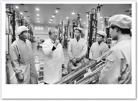 享受国务院津贴的河北工业大学教授、河北省科学技术突出贡献奖获得者任丙彦(左二)在给员工授课。