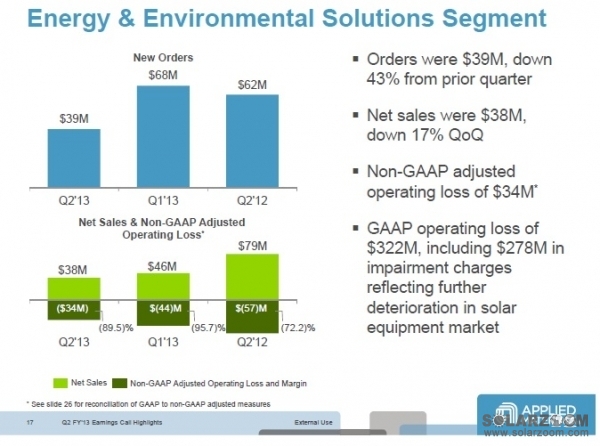 该公司表示,EES减值支出反映出太阳能设备市场的进一步恶化。管理层表示,其将进一步降低EES运营支出,使季度运营费用低于2500万美元。预计本财年第三季度运营成本将减少至3500万美元。