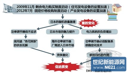 | 图1:量变将引发质变 在日本,由于太阳能电池装机容量迅速增加,太阳能电池功率调节器的竞争日益激化。随着竞争激化和配备EMS功能,功率调节器将发生质变。 |
