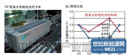 三家公司在卡车上实际配备1.2千瓦太阳能电池模块进行实证实验的结果显示,1个月的平均燃效最多可改善0.3公里/升。准备了款式及出产年份相同的卡车,对进行实际运营时的燃效进行了比较。结果显示,通过配备太阳能电池,可将休息及等货等怠速停止5分钟以上的时间,削减50%左右,有助于改善燃效。