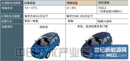 三菱化学推算,如果在车顶、发动机罩及车门等处共设置5平方米转换效率为10%的太阳能电池,输出便可达到500瓦左右。年发电量为326千瓦时,如果是1千瓦时可行驶距离为10公里的纯电动汽车,每年可行驶3260公里。如果能够这样利用太阳能电池较勤地充电,便可减少蓄电池配备量。由于蓄电池较重,因此削减配备量对于汽车厂商来说也很有吸引力。太阳能电池厂商目前正针对汽车厂商宣传这一优点。