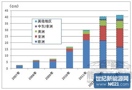 | 图1:全球光伏板出货量走势。预计2013年欧洲将大幅减少,但亚洲和美洲会增加。本图是2012年5月发表的数据,因此2012年也为预测值。是根据政策促进情况分析出的需求增加(出处:欧洲光伏发电协会(EPIA)) |