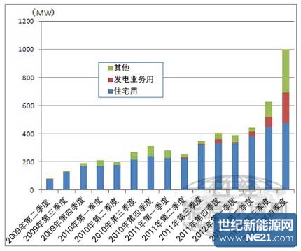 取代欧洲实现增长的是亚洲和美洲。亚洲方面,中国、日本和印度三大市场将实现增长。日本从2012年7月开始实行可再生能源固定价格收购制度,光伏板的设置数量随之猛增。日本的光伏板出货量在2012年第四季度首次达到了1GW(图2)。其中,住宅用途约占一半,包括百万瓦级光伏电站在内的发电业务用途占2成多。