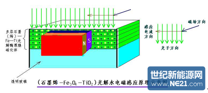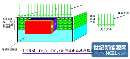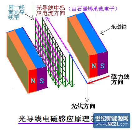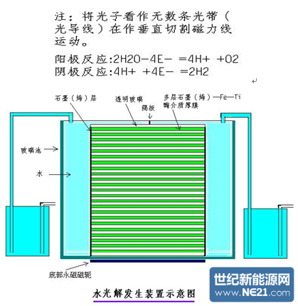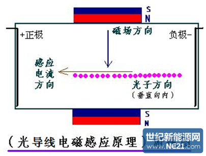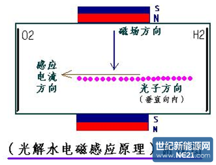制作一个由永磁场和水平透光酶介质膜组成的光电系统装置,将光电子引入磁场与光电磁理论结合起来。当太阳光照射时,将垂直磁力线方向的光导线视为切割磁力线运动。由弗莱明右手定则可知,该装置内水平方向酶介质膜内产生垂直于磁力线方向的感应电流。光电装置中酶介质膜内电子移动方向与感应电流反向。若该理论成立,会大大提高光电转换效率和光解水速度。用光电分解水制氢和便捷光电板充电器就会很方便,如氢燃料和真正意义上的手机光电面板就会产生。也可用于雷达波全吸收技术,将雷达波转换成感应电流,实现真正的隐形技术目标。(如图2)
