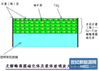 为使光电酶介质膜能快速输送电子,本设计采用多层(石墨烯—Fe—Ti)酶介质透明膜叠层结构,也可用其它光敏酶介质代替。其中引入石墨烯层为导电层即作为高效输送光电磁感应中电子的载体,也吸收光电子搭载传输;“Fe”为纳(微)米级Fe3O4磁铁矿粉,“Ti”为纳米级光敏TiO2,“Fe—Ti”视为光电极“P—N”结。介质中磁铁有利于使酶介质层磁化,增强光电磁感应效率。透明膜附着于透明有机玻璃薄板上,利于透光和定形。(如图3)