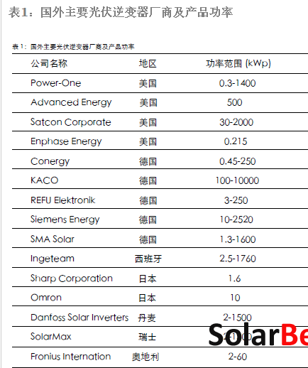 国外的光伏并网逆变器主要生产厂家包括SMA、Power-One、Kaco等。SMA是全球最早也是最大的光伏逆变器生产企业,以SMA为代表的国外光伏逆变器厂商起步早、技术成熟,引领者全球光伏产业的技术创新和发展,目前生产的产品品种多、系列全,稳定性、可靠性及变换效率均比较高;国外产品的另一个特点是智能化程度高,其根据光伏系统的实际应用,开发出智能化程度高的光伏逆变器产品,并配合监控系统、配电保护系统,构成一个功能完善的光伏发电系统。