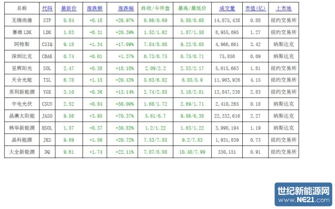 附表:2013年5月20日美国股市上中国光伏概念股的交易情况