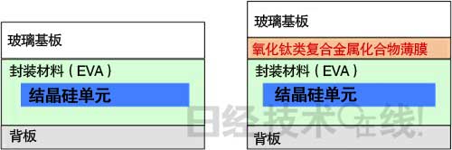 此次开发的技术在构成太阳能电池模块的玻璃基板上,涂布TiO2(氧化钛)类复合金属化合物薄膜并干燥,然后在200~450℃的温度下加热烧制约15分钟。涂布操作时采用了使包含原料的溶液滴落,然后通过金属道具和金属棒等稀释到整个基板上的“Doctor Blade法”。