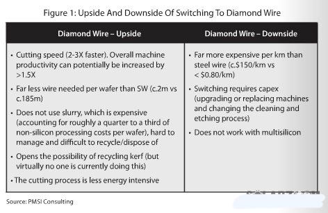 虽然对于这种在某条单一生产线上的改变很难做出以偏概全的描述,但是我们一般认为:与钢丝相比,现在改用金刚线可以减少成本约$0.10/片(假设生产线是为金刚线特别设计的)。