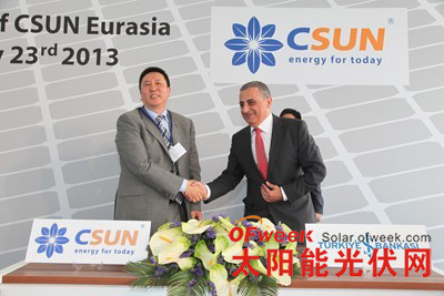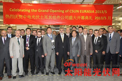 CSUN土耳其工厂总体规划产能包括300MW组件和300MW电池。该工厂的落成投产对于CSUN加快生产制造的全球布局,积极应对欧美双反具有重要的战略意义。在庆典仪式上,CSUN还与项目开发商Sybac公司签署100MW组件供应的框架协议,与土耳其TUV公司签署合作协议。土耳其本地银行AKBANK和ISBANK官方承诺将为CSUN在土耳其和欧洲市场的业务给予支持。