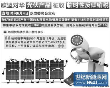 欧盟委员会日前正式宣布,欧盟将从6月6日起对产自中国的光伏产品征收临时反倾销税,前两个月的税率为11.8%,此后将升至47.6%。