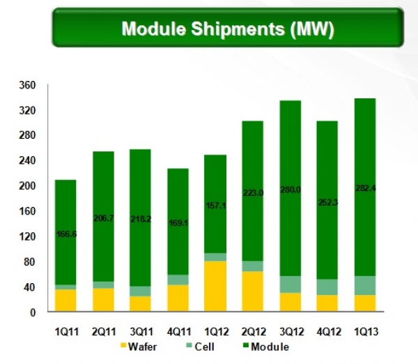 晶科预计公司二季度组件货量将达到450MW到470MW。2013年全年组件预计出货量在1.2GW到1.5GW。
