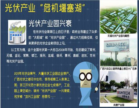 【光伏产业“危机堰塞湖”--产业园兴衰】2011年光伏业寒冬,大量光伏工业园企业停产。广西光伏之都无中生有,领导视察工人表演上班;浙江开化四十家光伏企业七成停产,工业园上演空城计;锦州“光伏产业园”一片萧索,名字被“龙兴工业园”所替代……