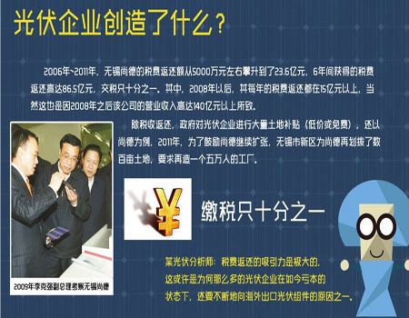 【光伏企业创造了什么?--缴税只十分之一】除税收返还,政府对光伏企业进行大量土地补贴(低价或免费),还以尚德为例,2011年,为了鼓励尚德继续扩张,无锡市新区为尚德再划拨了数百亩土地,要求再造一个五万人的工厂。