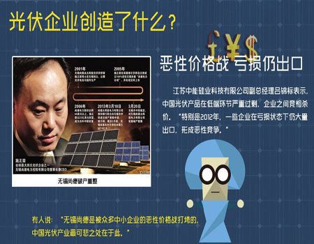 【光伏企业创造了什么?--恶性价格战 亏损仍出口】江苏中能硅业科技有限公司副总经理吕锦标表示,中国光伏产品在低端环节严重过剩,企业之间竞相杀价。“特别是2012年,一些企业在亏损状态下仍大量出口,形成恶性竞争。”