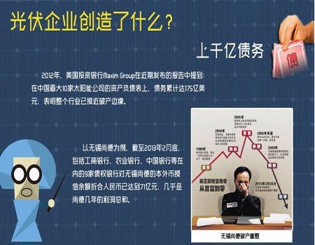 【光伏企业创造了什么?--上千亿债务】2012年,美国投资银行Maxim Group在近期发布的报告中提到:在中国最大10家太阳能公司的资产负债表上,债务累计达175亿美元,表明整个行业已接近破产边缘。
