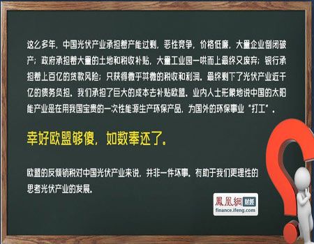 【结语】这么多年,中国光伏产业只获得微乎其微的税收和利润。最终剩下了光伏产业近千亿的债务负担。我们承担了巨大的成本去补贴欧盟。业内人士形象地说中国的太阳能产业是在用我国宝贵的一次性能源生产环保产品,为国外的环保事业"打工"。