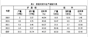 目前,我国80%多晶硅企业停产超过一年,2012年中国产能利用率仅三分之一;2013年一季度全国产量不足1万吨,产能利用率不足25%。随光伏行业钢性需求的增加,我国多晶硅产品的供应能力并未显著增强,内忧外患导致我国多晶硅行业的产业安全度降低。我国光伏行业产销状况见表2。