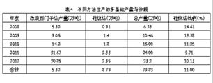 历史表现 近年来多晶硅不同方法生产的产量与份额见表4:由表4可看出,硅烷法多晶硅产量份额在11%左右。自2007年开始,中国共4家企业开展硅烷法多晶硅技术引进、研发和产业化,投资最多的是23亿元,年产3000吨多晶硅,至今没有产品上市。