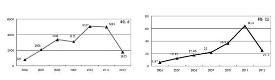 根据我国17家主要晶硅太阳能电池设备制造商的统计,2012年太阳能设备的销售量为1823台,销售收入仅25.3亿元,分别比2011年减少63.6%和60.7%。这17家主要制造商2012年晶硅材料生产加工设备销售收入达到11.16亿元,同比减少67.6%。晶硅太阳能电池芯片制造设备销售收入14.16亿元,同比减少52.7%。2012年太阳能设备出口交货值仅44.8万元,而2011年达到1.6亿元。