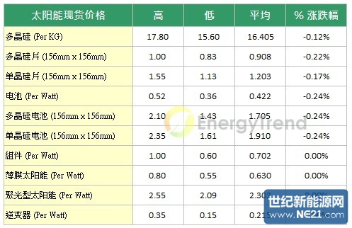 就现货市场整体表现来看,近期市场走向大致维持狭幅震荡的局面,但本周的整体走势出现小幅下滑的状况。而在分项产品方面,受到合约现货价差过小,近期业者货源主要以合约料为主,加上中国市场进口多晶硅价格出现走跌的影响,本周多晶硅现货市场价格出现小幅下滑的现象,平均价格来到$16.405USD/kg,跌幅0.12%。在多晶硅晶圆方面,近期部分大陆业者针对特定客户采取价格战,加上部分业者近期需求以一般品为主,因此拉低成交价格,本周平均价格为$0.908USD/piece,跌幅0.22%;而在单晶硅晶圆方面,大陆价格出现下滑,影响平均价格走势,本周价位来到$1.203USD/piece,跌幅0.17%。而在电池方面,部分业者报价出现滑落,主要集中在一般品部分,而在高效产品的价格上仍然维持$0.43USD/watt以上的价位,使得平均价格出现回跌,本周价位来到$0.422US /watt,跌幅0.24%;而模块价格则维持不变。